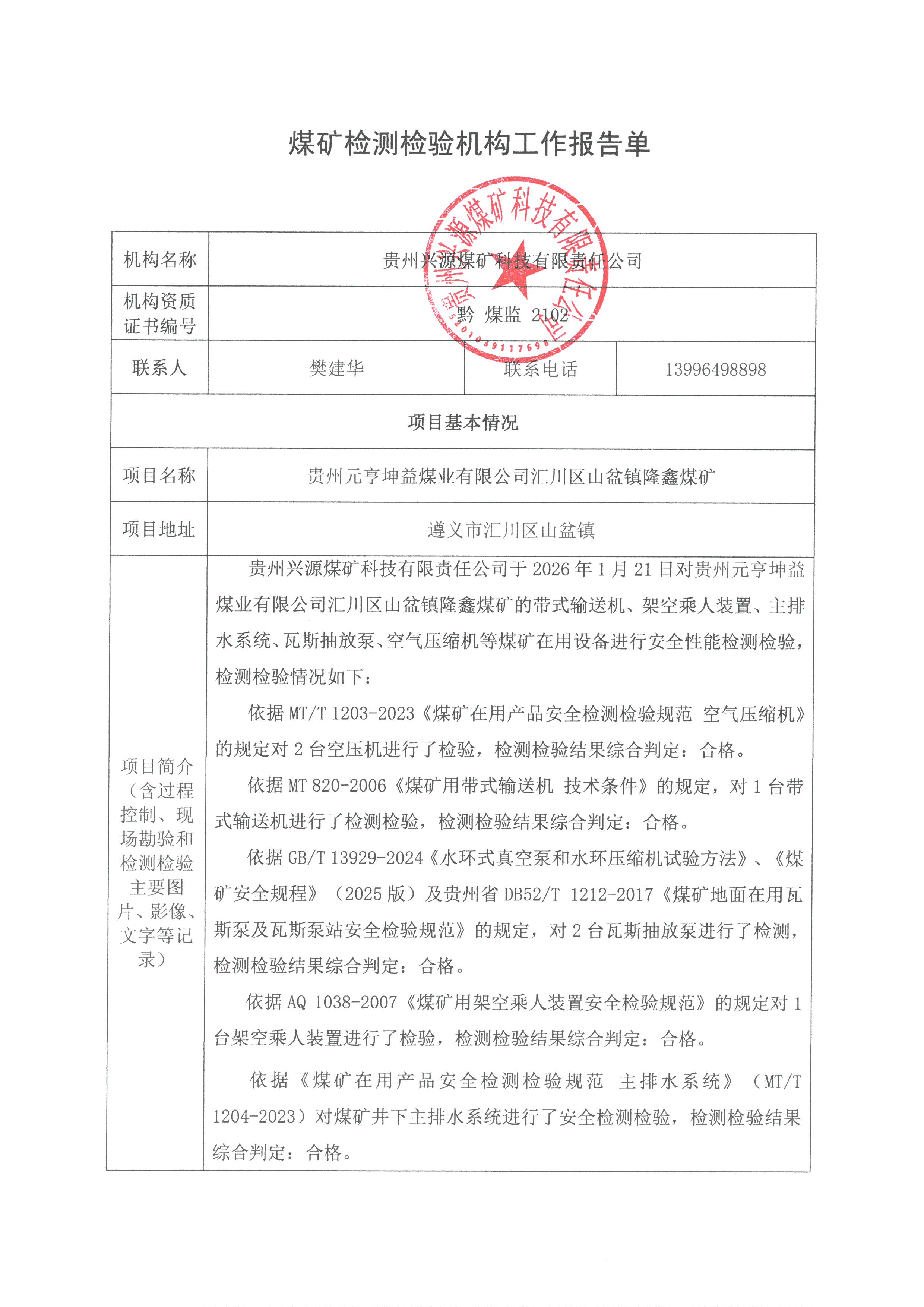 煤矿检测检验机构工作报告单【贵州元亨坤益煤业有限公司汇川区山盆镇隆鑫煤矿】