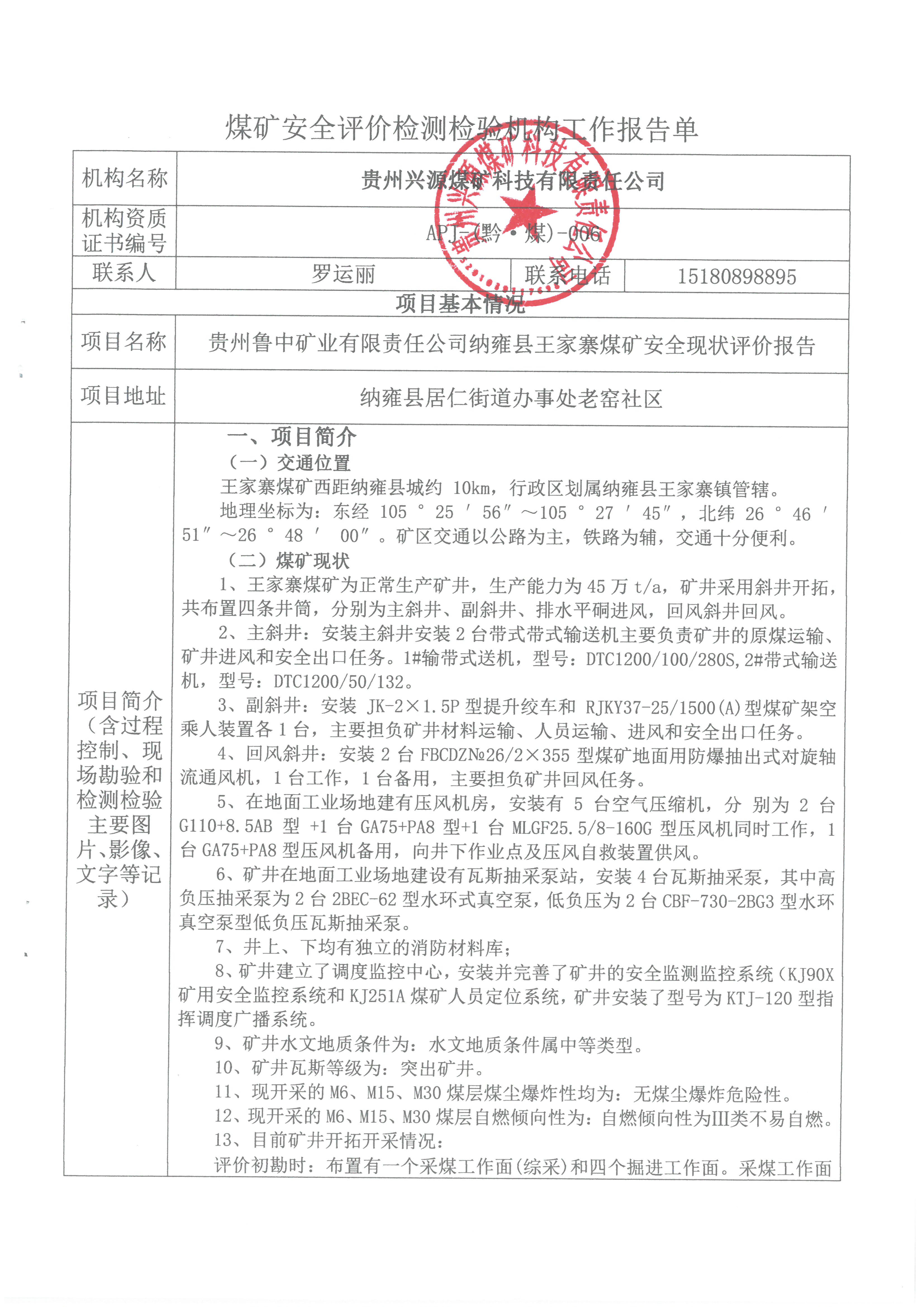 煤矿安全评价检测检验机构工作报告单【贵州鲁中矿业有限责任公司纳雍县王家寨煤矿安全现状评价报告】
