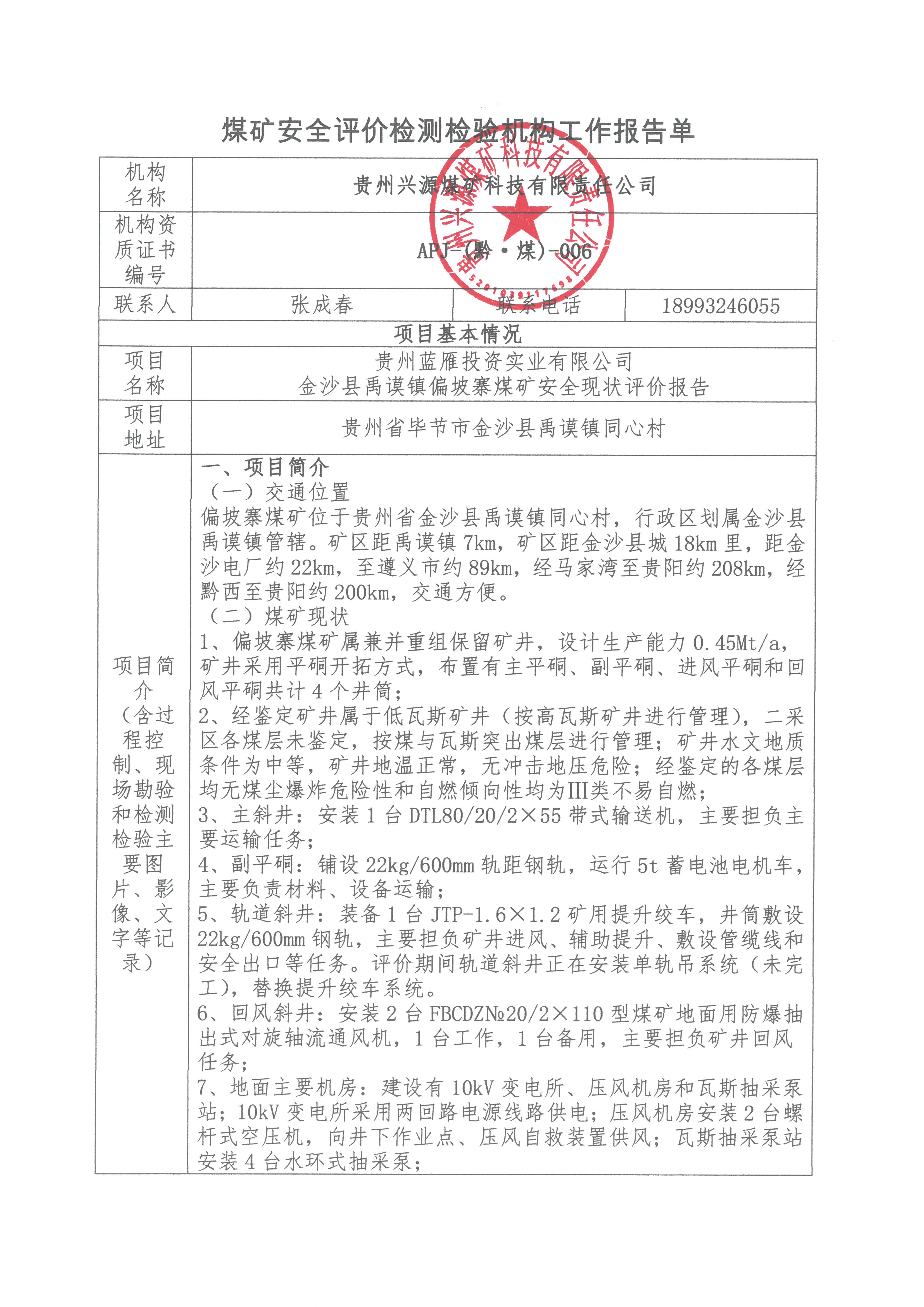 煤矿安全评价检测检验机构工作报告单【贵州蓝雁投资实业有限公司金沙县禹谟镇偏坡寨煤矿安全现状评价报告】