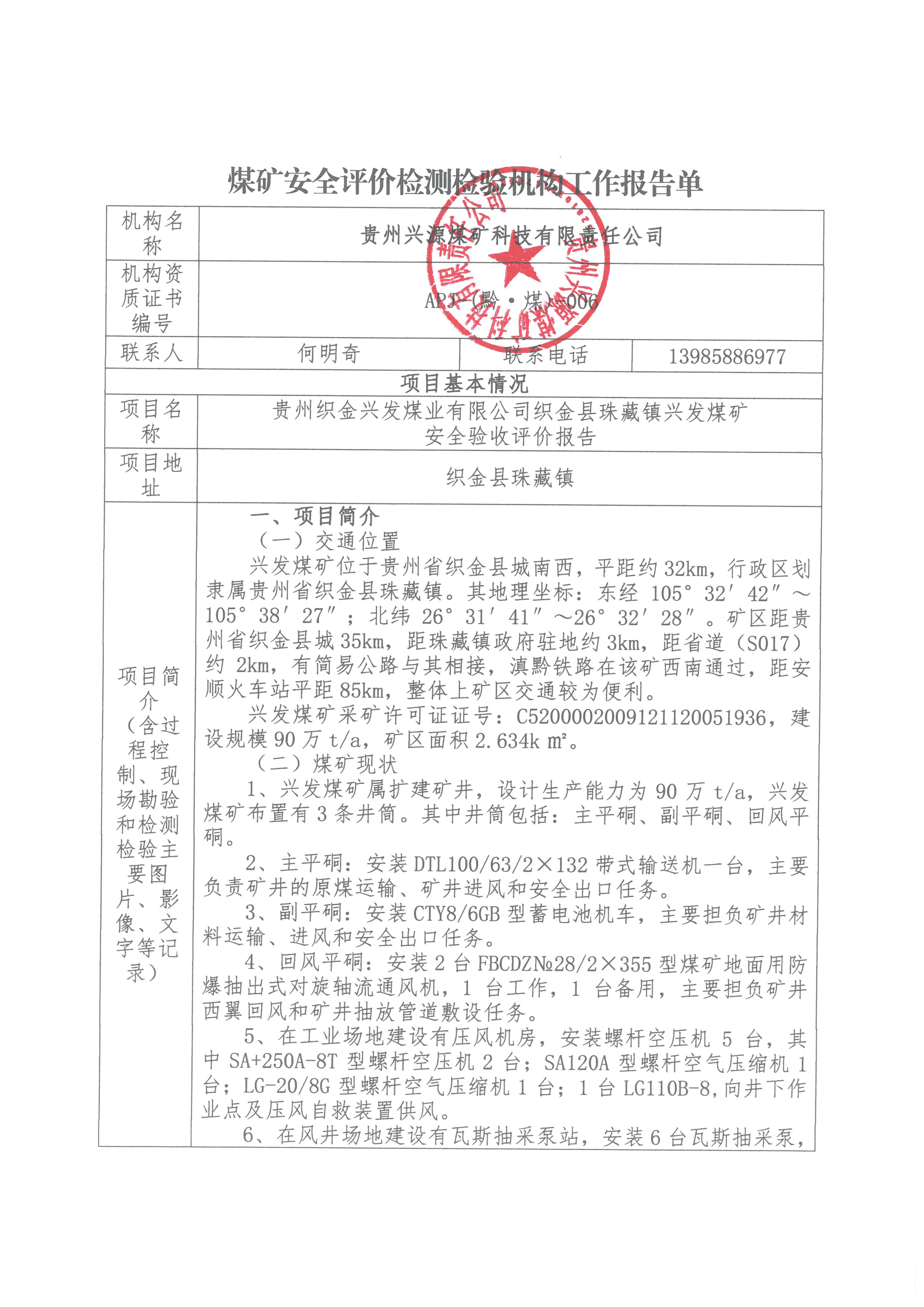 煤矿安全评价检测检验机构工作报告单【贵州织金兴发煤业有限公司织金县珠藏镇兴发煤矿安全验收评价报告】